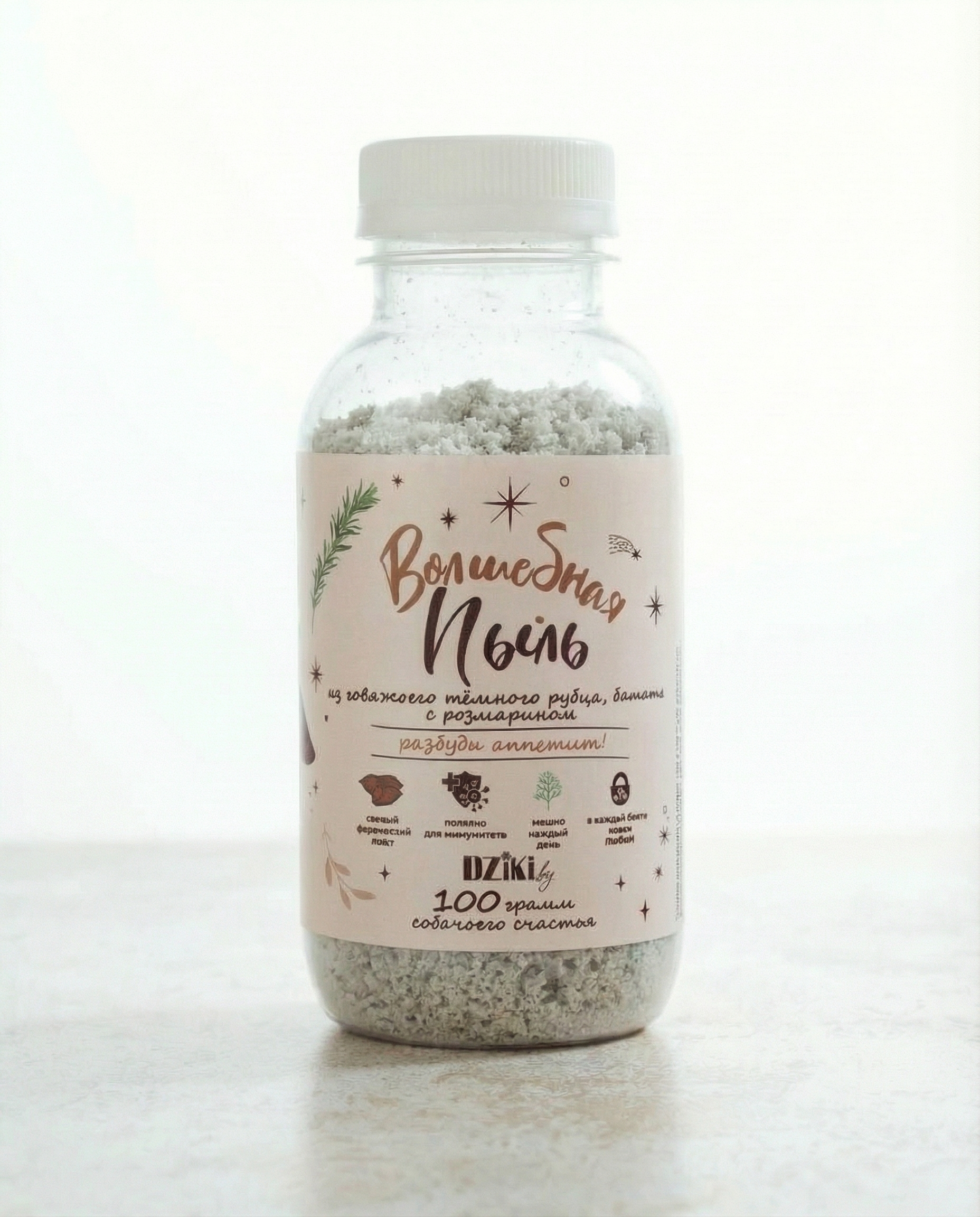 Если ваш питомец перебирает едой или стал плохо есть, «Волшебная пыль» поможет вернуть интерес к миске. Это 100% натуральная посыпка из говяжьего тёмного рубца, батата и розмарина — ароматная, вкусная и полезная добавка к любому корму.
