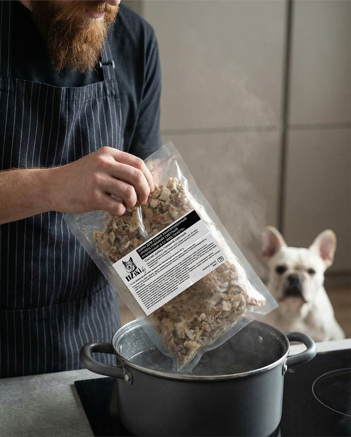 Если ваш питомец ест только термически обработанные продукты, то необходимо после разморозки поместить запечатанный пакет в кастрюлю с горячей водой, которая ещё не начала кипеть (65-75°С). Варить на маленьком огне 25-35 минут.